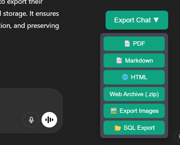 With ExportGPT, select from a diverse range of formats to preserve your captivating ChatGPT conversations. Whether you favor PDF, Markdown, HTML, SQL, or ZIP, we offer various choices that accommodate your needs and tastes. This versatility guarantees that you can pick the format that aligns best with how you want to archive or share your important discussion insights.
