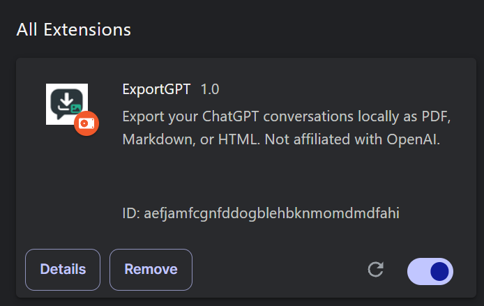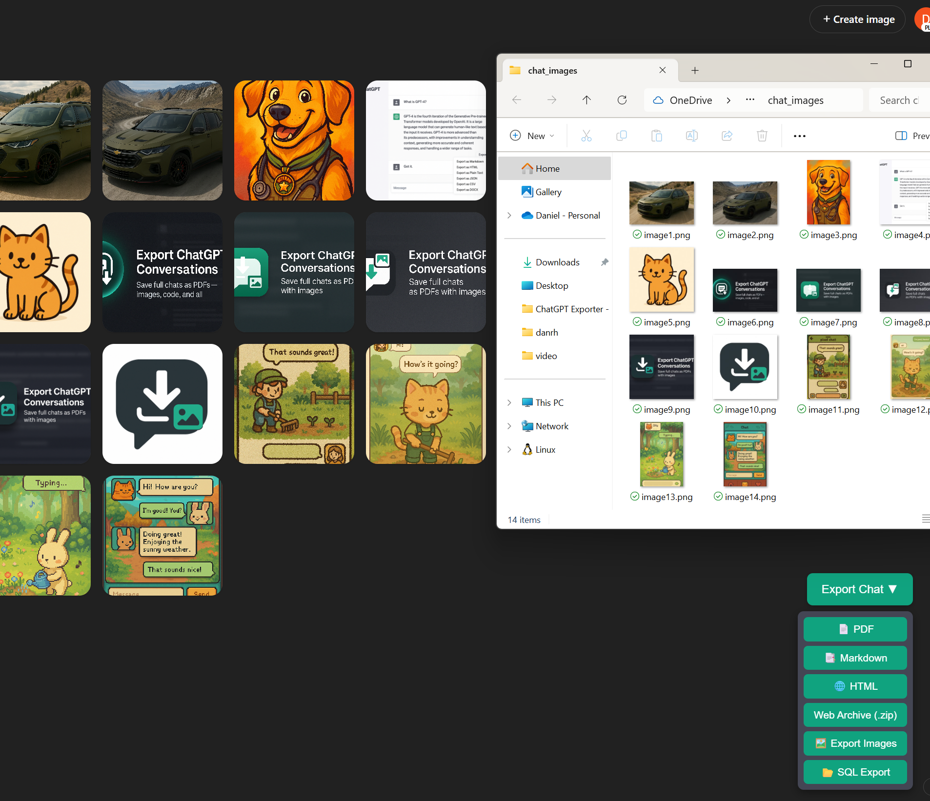 Take control of your ChatGPT conversations with our easy-to-use browser extension. Download it now to store your chats and created images as PDFs, Markdown, SQL, or HTML files for offline access.